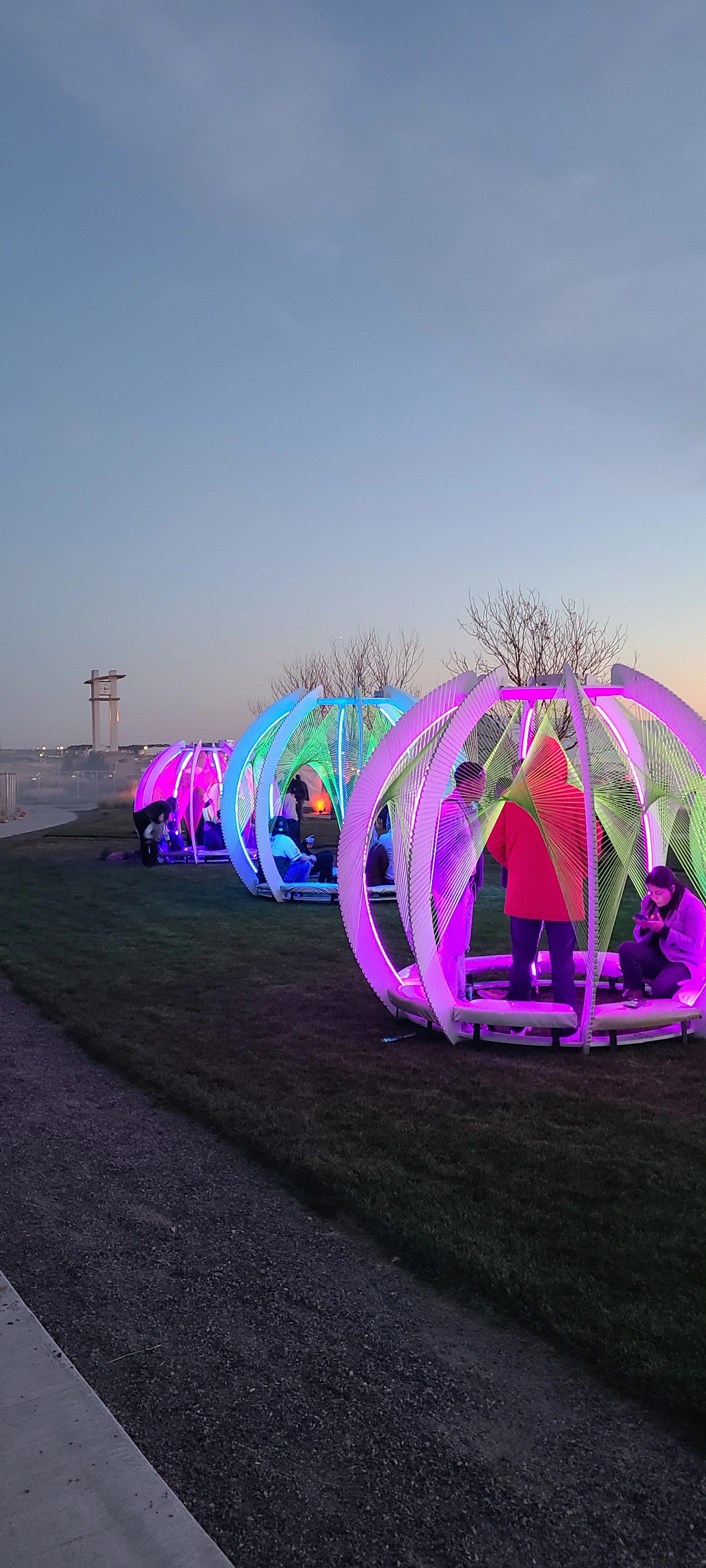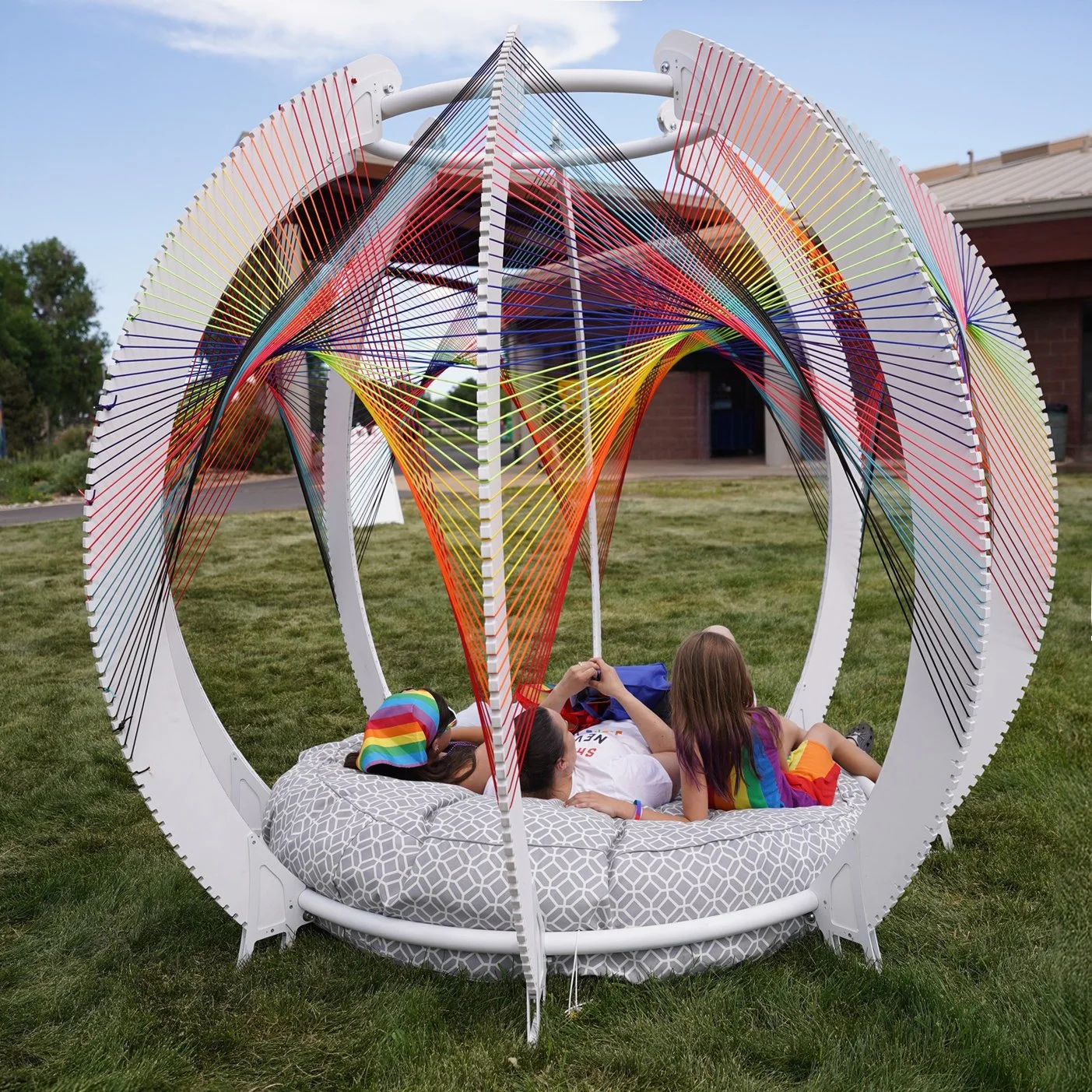 Lyre 72 is a large-scale woven light sculpture series by artist Diana Merkel, featuring colorful, handwoven thread patterns stretched across a towering spherical frame. These orbs serve not only as striking visual centerpieces, but also interactive seating areas designed for public spaces and high traffic events.